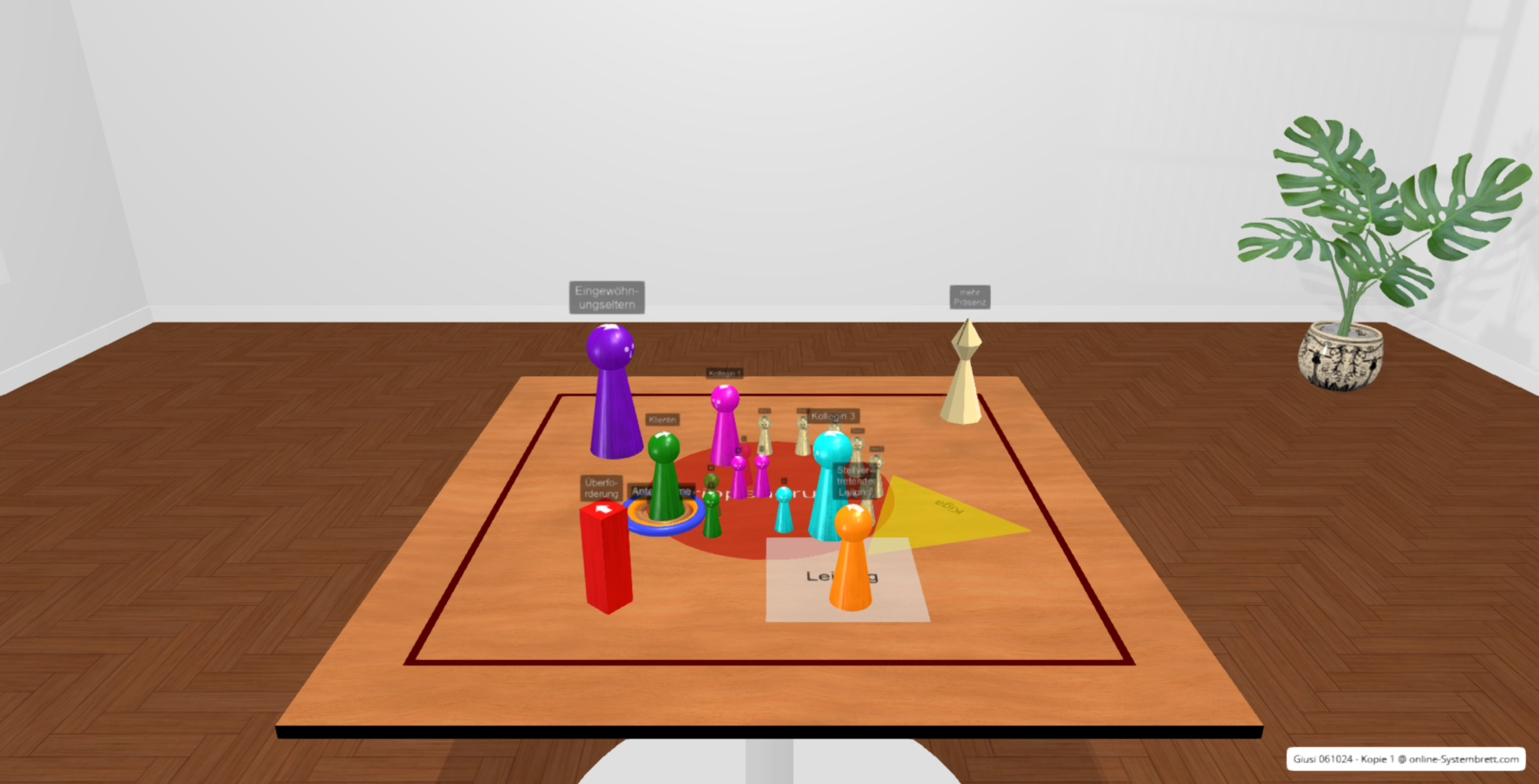 Sie stellen Ihre Situation räumlich dar: z. B. sich selbst, Kolleg:innen, Vorgesetzte, Projektbeteiligte oder belastende Themen wie Konflikte, Überlastung oder Unsicherheiten.
